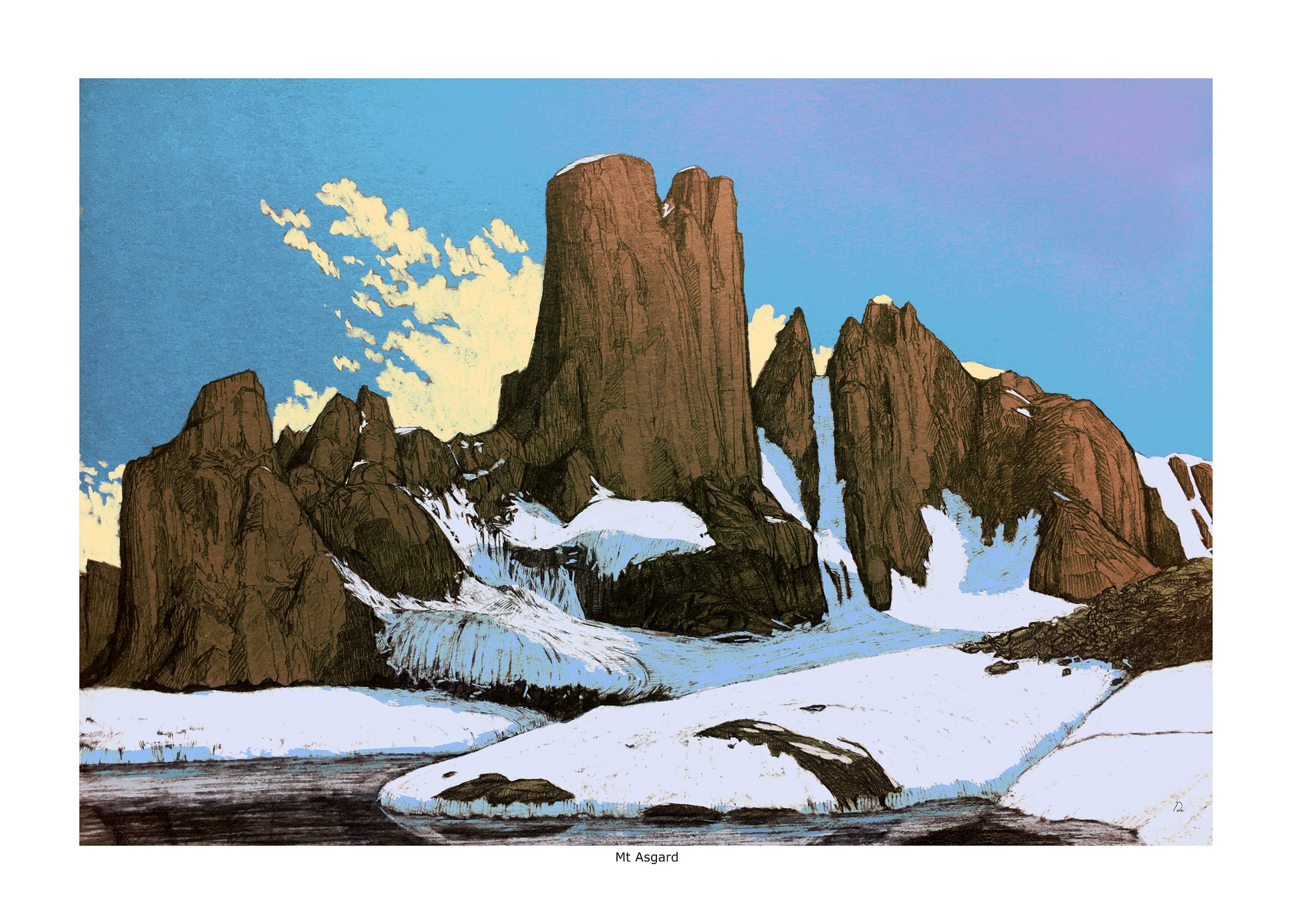 Drawing of Mt Asgard, a twin-peaked mountain on Baffin Island, Canada.